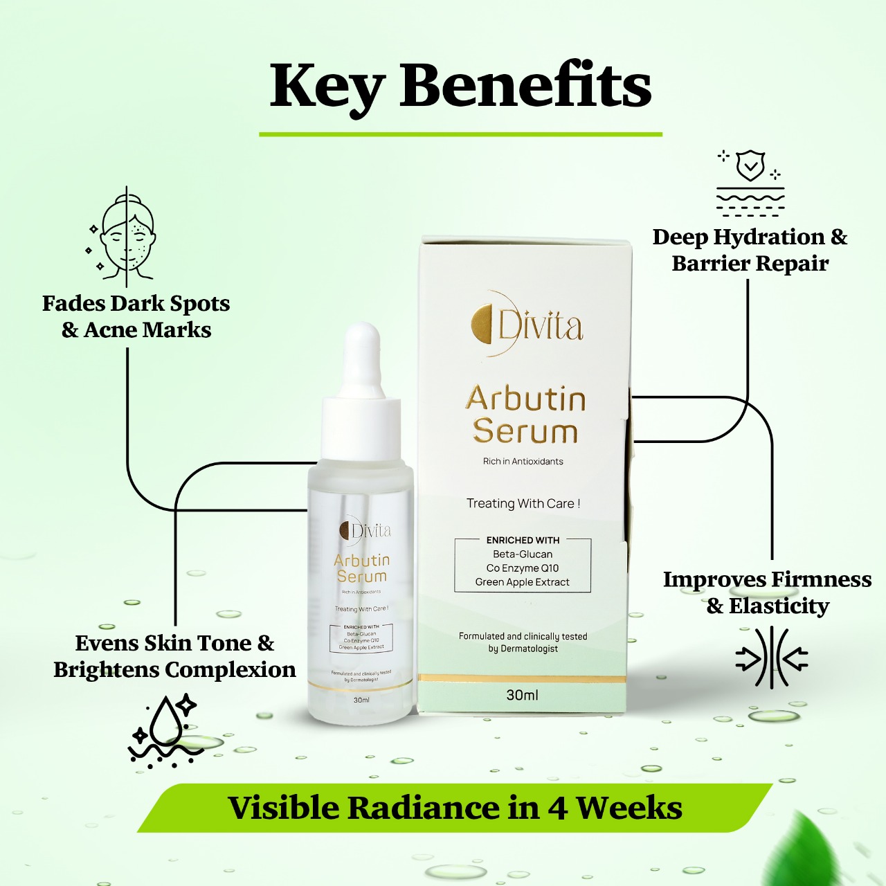 With consistent use, arbutin serum brightens and improves skin texture in 1-2 weeks, fades dark